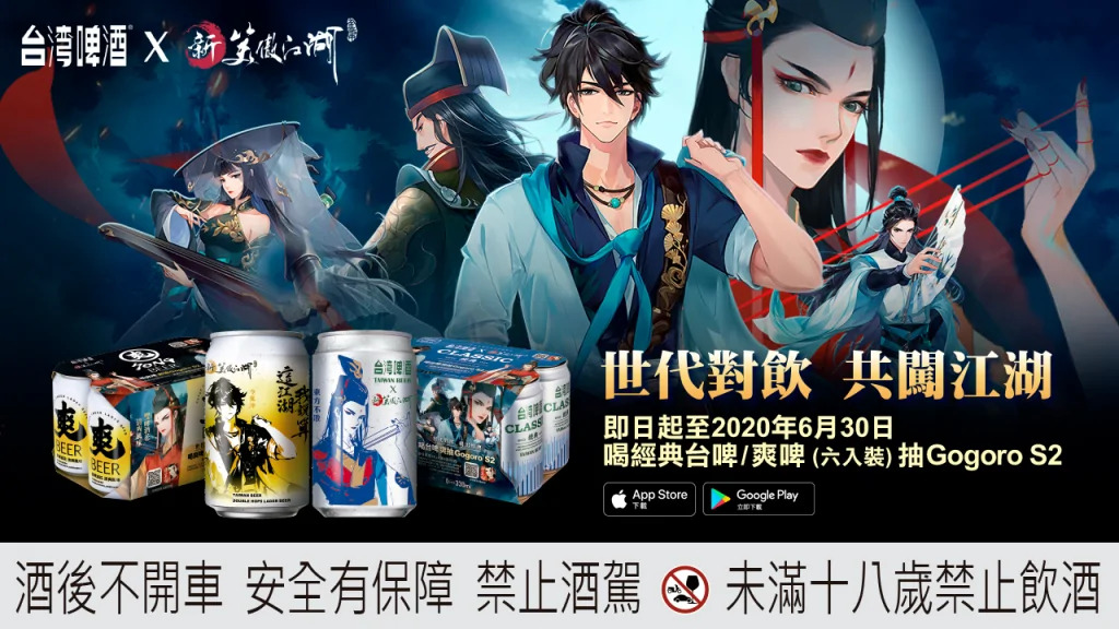《新笑傲江湖M》與經典人氣品牌台灣啤酒,於本月聯合推出限量經典包裝,將金庸筆下瀟灑不羈的令狐沖及敢愛敢恨的東方不敗,以獨特遊戲動漫繪風,融入指定罐身和六入盒裝設計,讓喜愛金庸武俠的遊戲玩家一次收集,即日起,玩家只要購買主題版六入裝經典台啤或爽啤,憑盒內序號,登錄即可得遊戲虛寶;再抽總價值達百萬的實體贈品 Gogoro S2 機車、Iphone11 及Google pixel 等多樣豐富大獎。