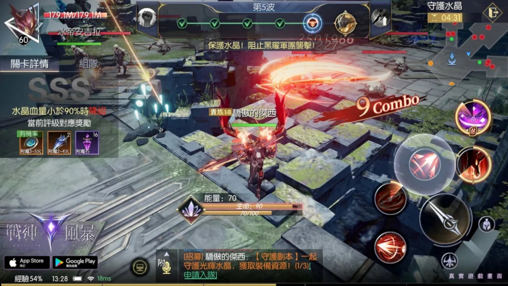 《戰神風暴》中有豐富龐大的各類副本玩法,除了有助於玩家等級成長的經驗副本外,還有挑戰首領、及守護副本等特色玩法。其中守護副本由3個輪換的組隊PVE玩法組成,包含守護米婭、守護水晶及守護傳送門。3個玩法都有特殊機制,守護水晶是阻擋怪物進攻;守護米婭需要採集地圖上的道具治療米婭,守護傳送門則需要通過消滅小怪收集點數,召喚魔寵助戰守護塔防。融合了塔防、機關等多重機制,在趣味性和可玩性上大大提升。同時在關卡等級提升時,也會造成副本難度的加大,在副本玩法中,增添遊戲玩時的驚喜體驗!