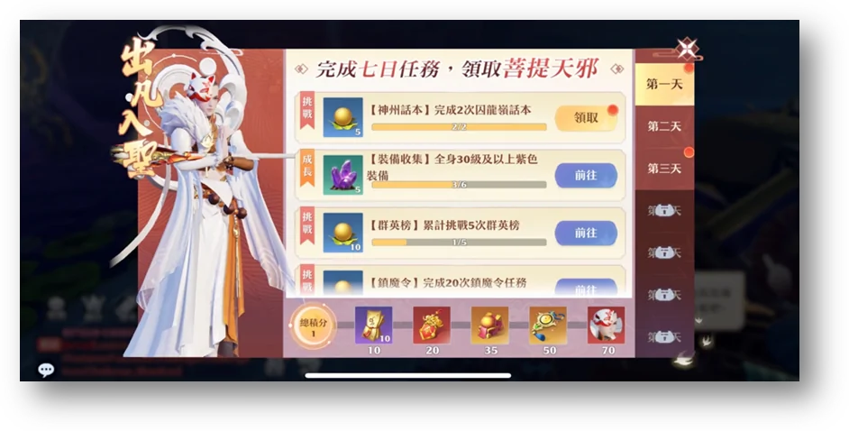 封測期間,完成出凡入聖每天的任務可領取獎勵,完成任務達到一定數量可獲得仙珍奇寶和精美華裳!都是實用精品,一個都不能錯過哦!