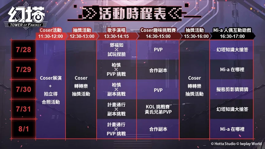 除了連續5天不間斷的試玩及贈獎活動,7月28日漫博開幕首日,營運團隊更邀請到療癒系歌手鄧福如現場演唱《幻塔》主題曲〈SALVATION〉以及〈MEANT TO BE〉,鄧福如也將現場試玩遊戲內容,與拓荒者同樂。另外,展會期間還邀請到人氣YouTuber黃氏兄弟到現場與拓荒者互動玩遊戲!同時,更邀請到人氣網路歌手計畫通行及柏慎在現場演唱《幻塔》主題曲及與拓荒者們互動贏獎勵,完整舞台活動等著拓荒者們至現場解鎖!