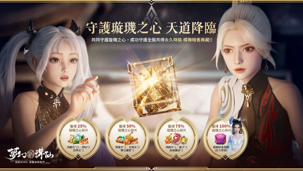 為歡慶全新門派「天道府」來襲,營運團隊準備眾多好康回饋玩家。即日起完成預約,即可獲得含仙友寶篆、神鑄令及白虎星符等多項豐富虛寶的「天道在我」大禮包!不僅如此,玩家只要集氣成功,營運團隊更加碼全服送出「蝶舞暗香‧典藏」永久時裝。邀請朋友一同完成預約,還能獲得“仙友殘卷”、“天帝瓊漿”、“轉職券”等豐富虛寶獎勵,讓玩家能輕鬆轉職,體驗天道府的魅力。趕快邀朋友一起完成任務,將滿滿的虛寶獎勵帶走吧!