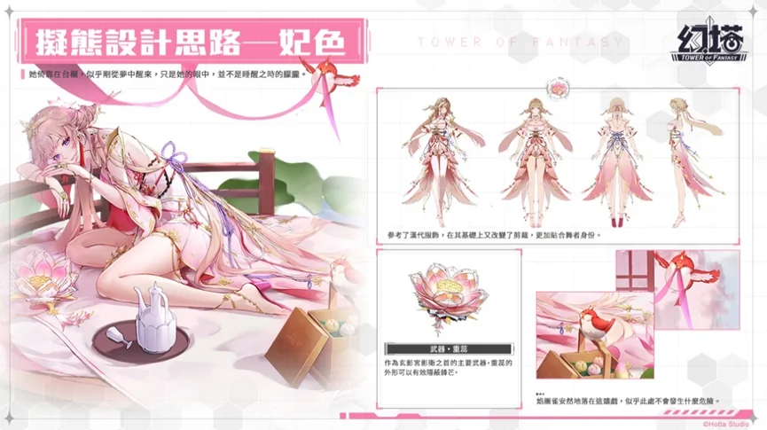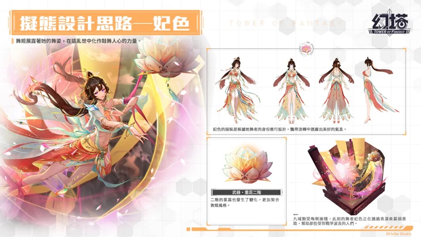 圖說:研發團隊在設計妃色的角色人物及外觀造型時參考漢代服飾,並在這基礎上做出不同的剪裁變化,讓整體設計更符合其絕色舞姬的身份。