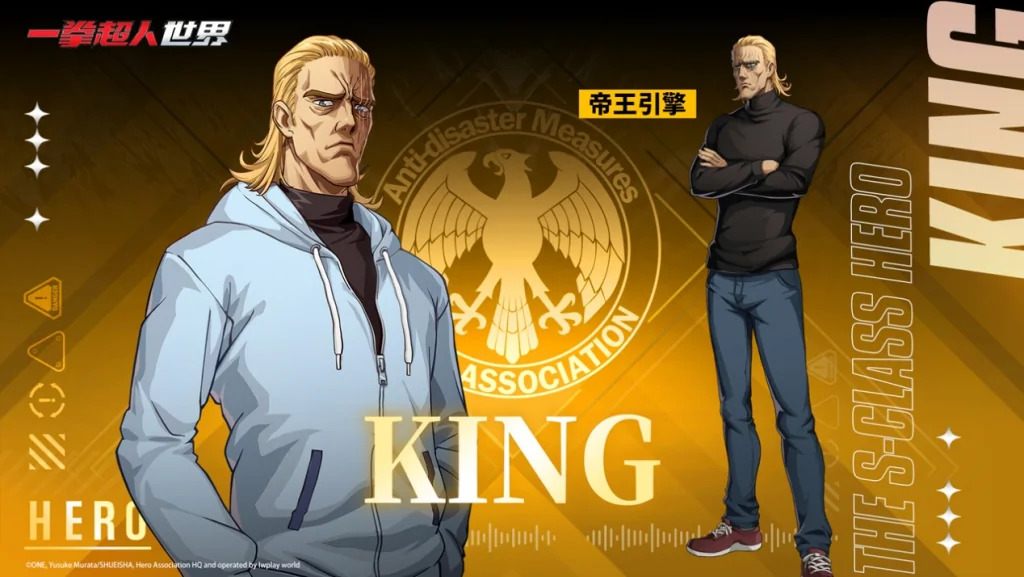 有著地球上最強男人之稱的KING是S級英雄角色,經常遇到怪人的他,除了埼玉以外,無人得知他的真實實力。但在戰鬥時,他著名的“帝王引擎”有著非同凡響的影響力,更讓敵人感到深深的壓迫及恐懼。