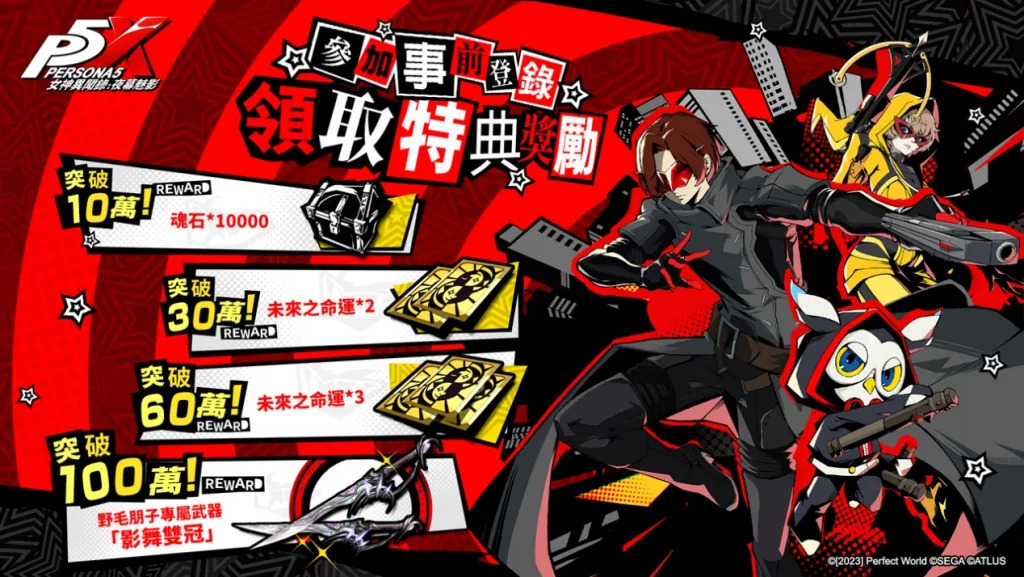 P5X目前正在官網進行事前登錄活動,玩家登錄完成即可獲得主人公限定時裝,達成活動條件更可獲得稀有怪盜偶像「野毛朋子」及其專屬武器 – 影舞雙冠,以及有機會抽實體遊戲主機及P3R盒裝限定版、P5T NS普通盒裝版等獎勵,P5X運營團隊更規劃了趣味探索網站活動,玩家在活動中將探索白天與黑夜的雙重世界,隨著玩家的探索進度越高,就能獲得更豐厚的活動獎勵和限量周邊!請玩家務必前往一探神秘殿堂,更多地圖區域將於後續陸續開放,請持續關注官方最新資訊。