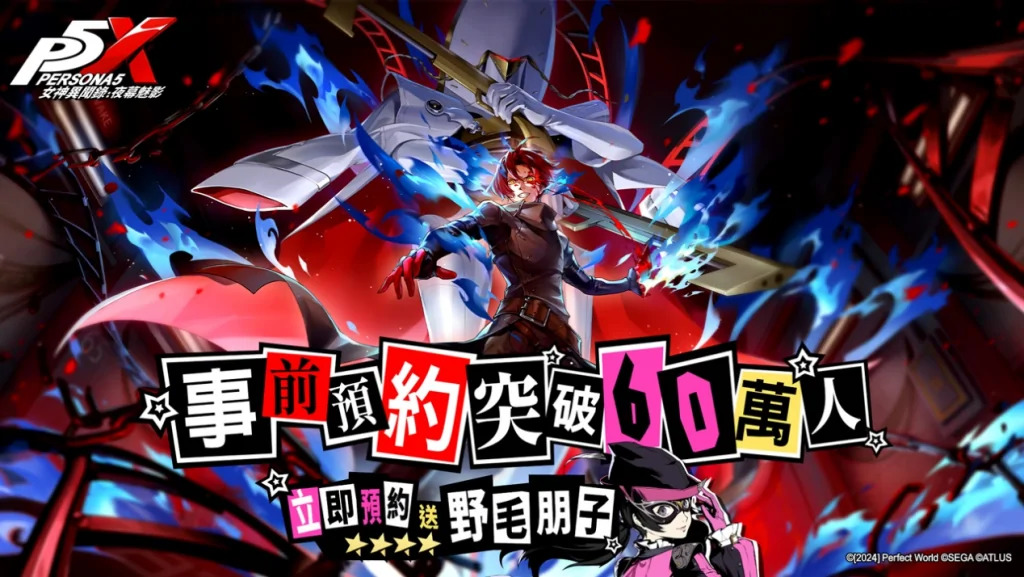 P5X 即日起至 2 月 5 日進駐「2024台北國際動漫節」(攤位號碼:B0909-1117),活動現場雙平台預約持續火熱進行中!玩家只要在iOS、Google Play任一平台完成預約,即可獲得稀有怪盜偶像「野毛朋子」以及角色免費連續抽,更有機會抽到野毛朋子立牌等精緻遊戲周邊。官方今日更宣佈雙平台預約玩家已達 60 萬人,將解鎖發送未來之命運X5、魂石X10000等豐富達標獎勵虛寶給玩家。