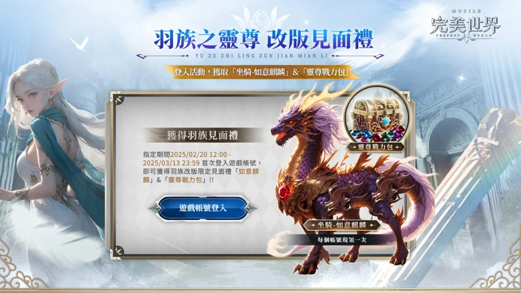 由艾玩天地所代理的跨世代MMORPG手遊大作《完美世界M》,於今(2月27日)宣佈羽靈全新男角來襲,神月谷副本全新首領及新增詞綴同步上線。為歡慶本次改版,玩家只需到活動頁面完成網頁登錄即可獲得霸氣坐騎-如意麒麟及靈尊戰力包;參與網頁活動-羽族召集•神月谷終結之戰,擊敗首領還能額外獲得豐富虛寶獎勵。