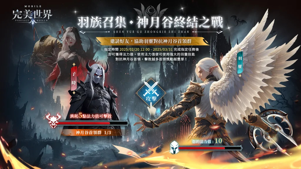 圖說:玩家在活動網頁參與「羽族召集•神月谷終結之戰」,透過完成指定任務即可獲得對應法力值,對神月谷首領進行攻擊!擊敗首領更能獲得神獸精華、玄龍珠、凝魂丹、獸元丹禮盒及火鳳翎等豐富虛寶獎勵。