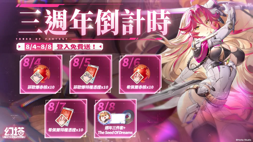 為歡慶《幻塔》上市三週年,同時感謝授權者的支持與喜愛,營運團隊特別規劃多項限定活動及福利回饋授權者。即日起登入遊戲,並達成指定條件即可獲得菲歐娜赤核、菲歐娜特種憑證等豐富虛寶好禮,2025/8/8當天登入遊戲更壓軸送出週年三件套限定外觀裝飾及限定CD-The Seed Of Dreams。
