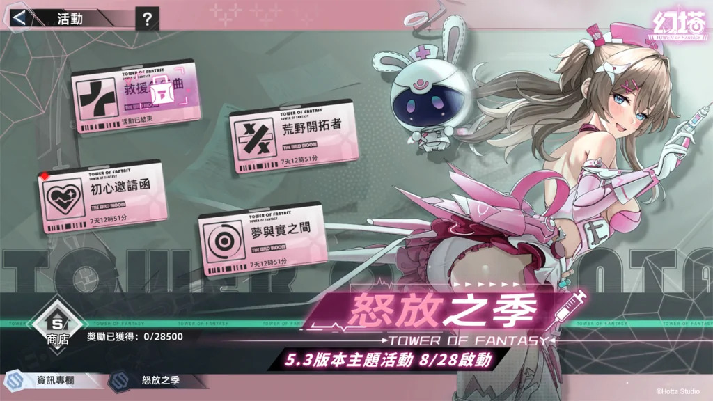 圖說:5.3版本主題活動-怒放之季限時開啟,營運團隊特別規劃救援急行曲、荒野開拓者等活動讓授權者參與活動贏取豐富虛寶獎勵!不僅如此,2025/9/10至9/22期間累積登入《幻塔》7天,最高可獲得墨晶*1000!
